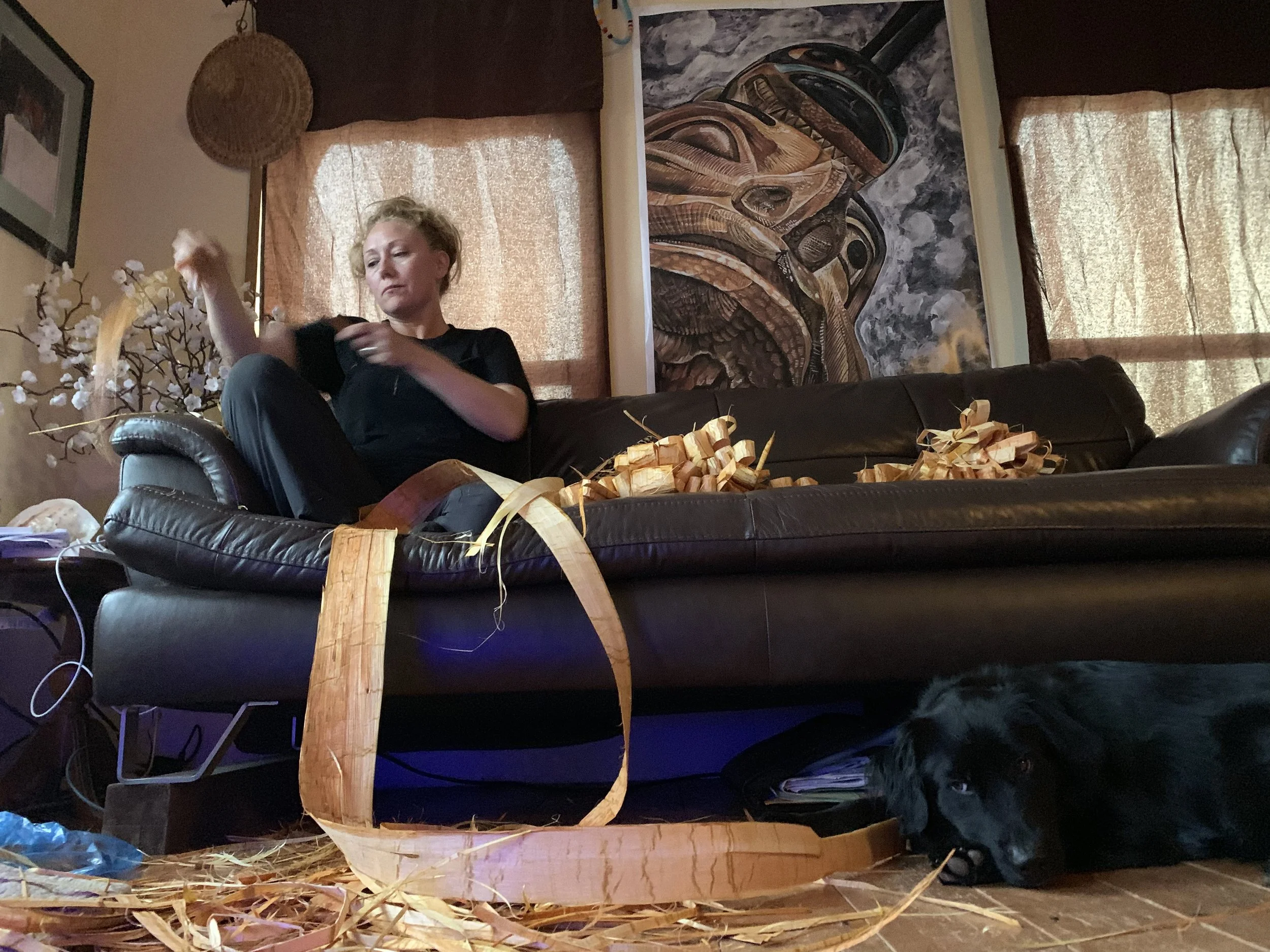 This summer, our focus turned to gathering the remaining red cedar needed to complete the sail—plus a little extra to begin the next one. We spent many days in the forest harvesting and at home carefully processing the bark into strips for weaving. Along the way, we were joined by friends of the project, experienced weavers and harvesters, and even had the joy of taking youth on their very first harvest. One of the highlights of the season was being shown a magical harvesting site that provided most of the cedar for our sail.