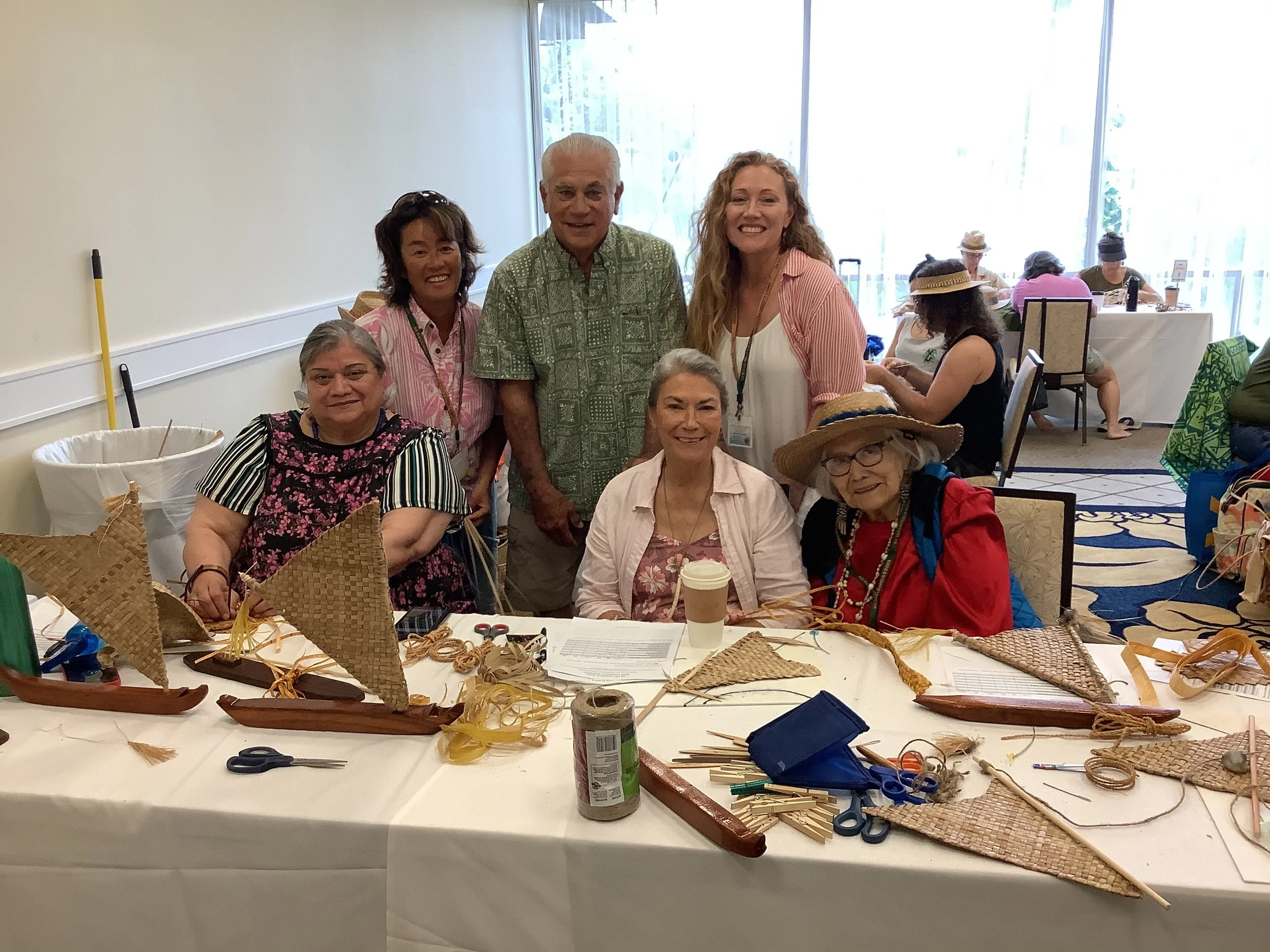 Visit to the Lauhala weaving conference to meet with Hawaiian weavers. Met with sail weaving expert, Kumu Maulili Dickson. Delores, Paula, Evelyn, and Holly each got to weave 2 miniature sails.
